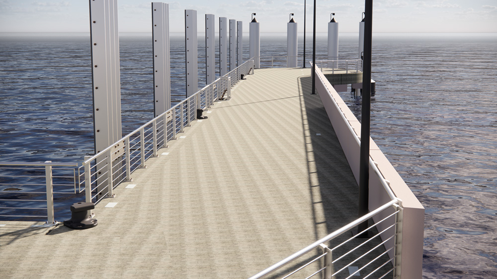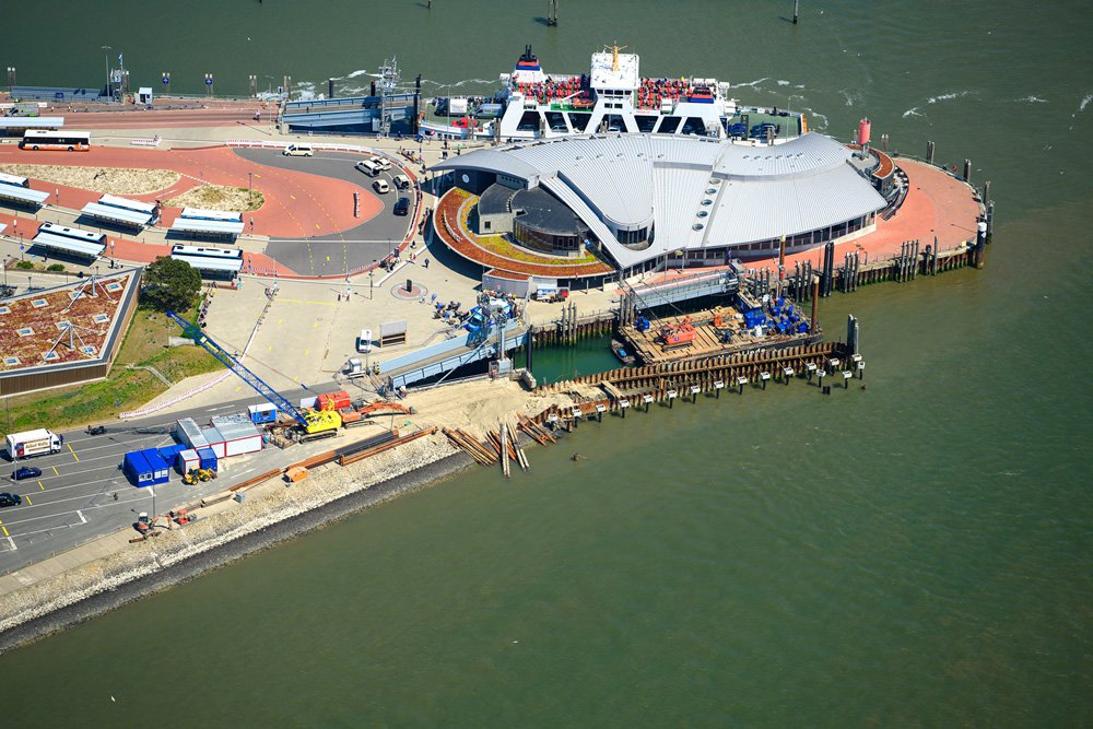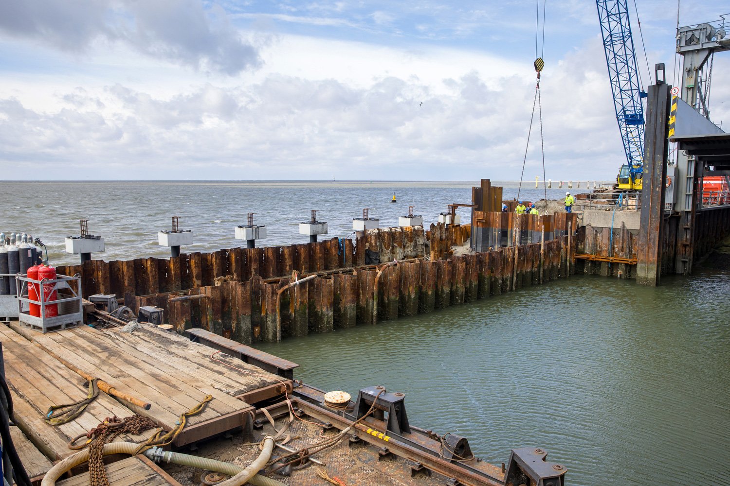 Ursprünglich für letztes Jahr eingeplant, musste die Maßnahme zugunsten des LNG-Anlegers in Wilhelmshaven zehn Monate pausieren. Personal und Gerätschaften wurden für die Energiedrehscheibe an der Jade dringend benötigt. Ende März 2023 ging es an der Südmole weiter. Seitdem ist viel passiert: Ein Teil der alten Mole wurde schon zurückgebaut, parallel hat der Neubau begonnen. Über einen Arbeitsponton wurden die ersten Stahlpfähle für die neue Konstruktion eingebracht. Auf einige dieser Pfähle wurden die ersten Beton-Fertigteile aufgesetzt. Zudem wird der alte Fangedamm zurückgebaut, bevor der Neubau der Schwallwand beginnt, die den Fähranleger gegen Wind und Wellen schützen wird.