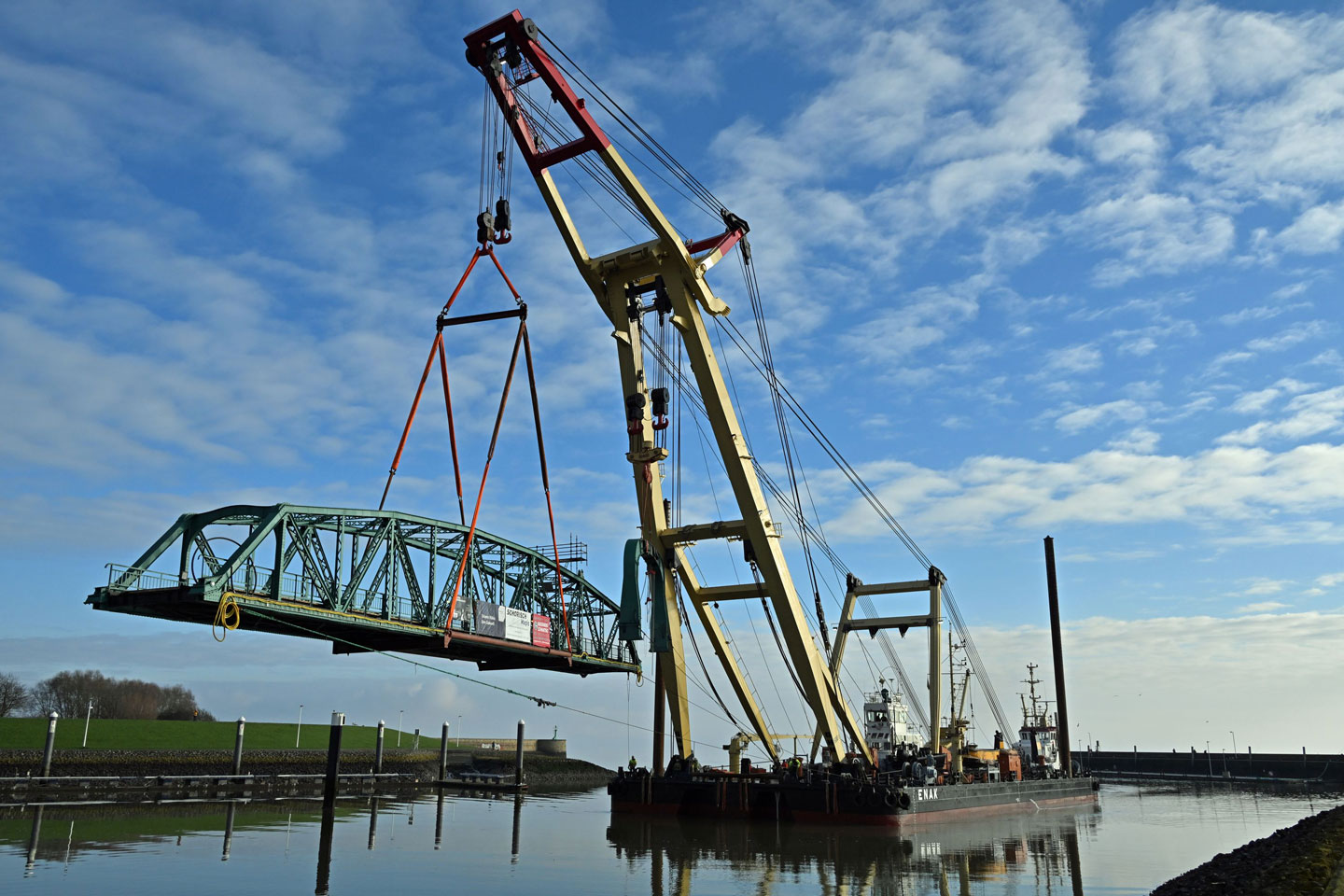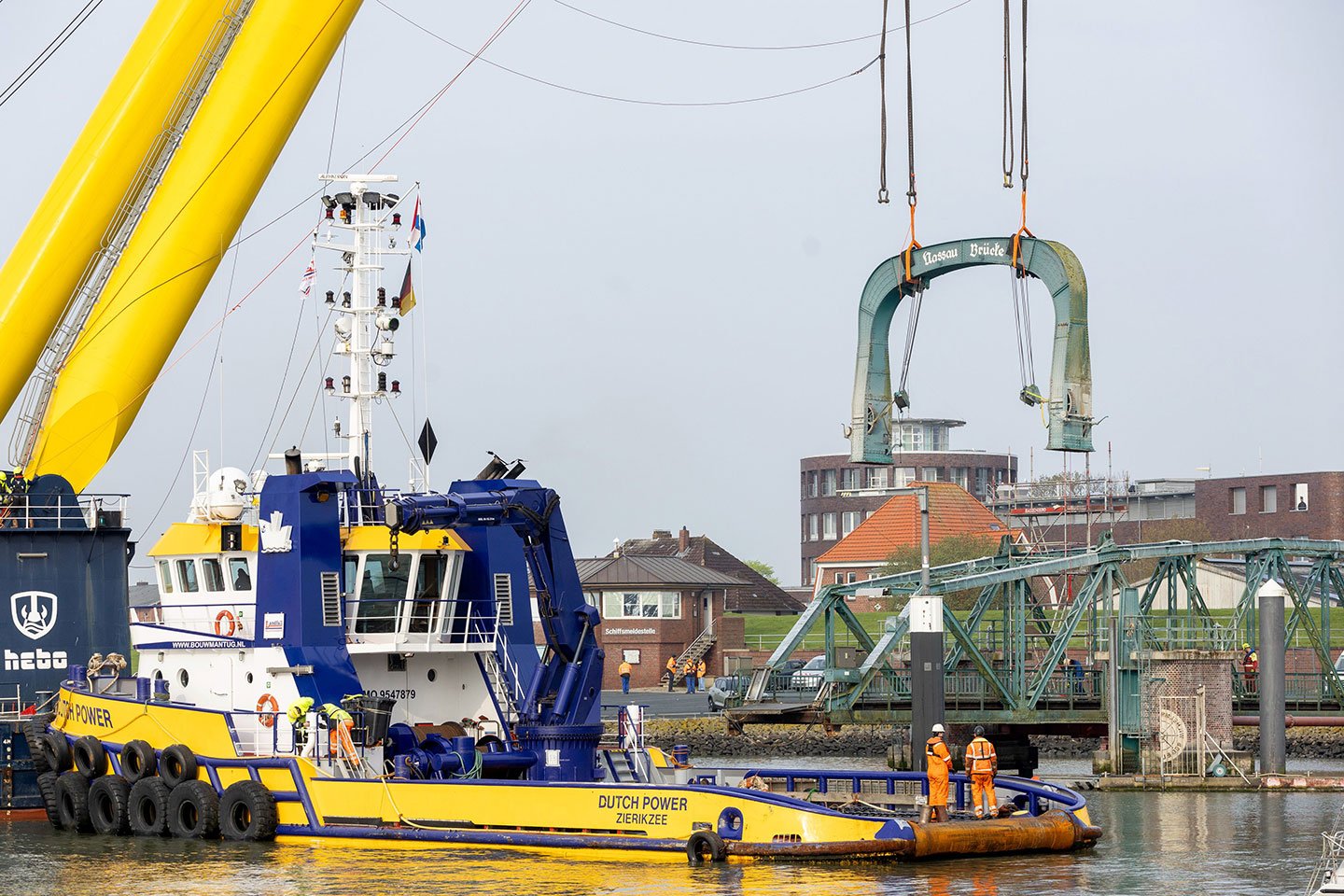 - Am 23. April 2025 hatte Niedersachsen Ports den Portalbogen der über 100 Jahre alte Nassaubrücke mit einem Schwimmkran auf die Reise in die Instandsetzung geschickt. (Bild: Andreas Burmann/NPorts)