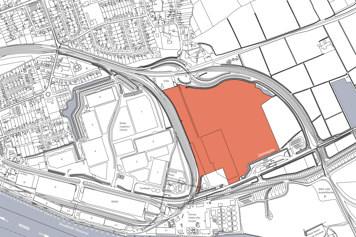 - ca. 22 ha unbebaute Fläche im Boitwarder Groden mit Straßen und Gleisanschluß sowie Zugang zum Nordpier und zum Niedersachsenkai